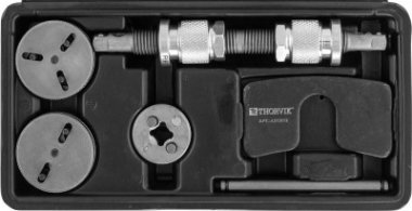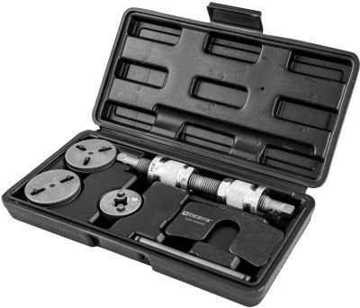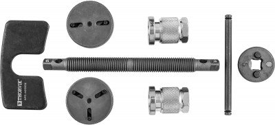 Набор для возврата поршней дисковых тормозных механизмов применяется при ремонте и обслуживании суппортов дисковых тормозов легковых автомобилей. Принцип действия данного инструмента основан на воздействии путем совмещения двух усилий, вращательного, перпендикулярно оси вращения поршня, и осевого, для возврата в исходное положение поршня рабочего цилиндра тормозного суппорта. Ходовой винт с правосторонней и левосторонней резьбой, а также наличие двух насадок с двумя и тремя регулируемыми по ширине направляющими, позволяет обслуживать тормозные системы широкого дипазона автотранспортных средств.