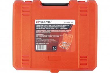 Приспособление с пневматическим приводом для возврата поршней дисковых тормозных механизмов в наборе, 16 пр. Thorvik ACPTK16P 53232 применяется при ремонте и обслуживании суппортов дисковых тормозных механизмов легковых автомобилей таких марок, как: audi, toyota, ford, honda, peugeot, renault, citroёn, nissan, gm и подобных.