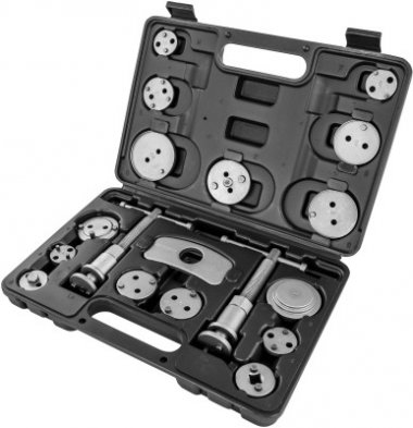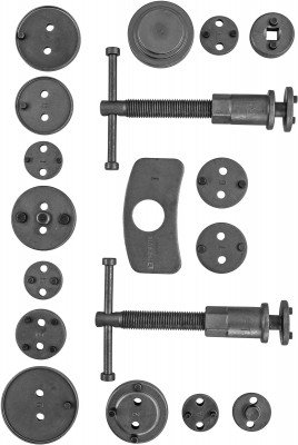 Набор для возврата поршней дисковых тормозных механизмов применяется при ремонте и обслуживании суппортов дисковых тормозов легковых автомобилей. Принцип действия данного инструмента основан на воздействии путем совмещения двух усилий, вращательного, перпендикулярно оси вращения поршня и осевого, для возврата в исходное положение поршня рабочего цилиндра тормозного суппорта. Наличие большого количества насадок обусловлено разнообразием форм днищ поршней тормозных цилиндров у разных производителей.