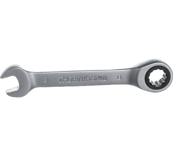 Гаечный ключ Thorvik CSRW08 комбинированный трещоточный короткий, 8 мм 53517 подходит для быстрой и качественной работы с крепежом различной сложности. Инструмент обеспечивает полный охват граней, что защищает их от стирания.