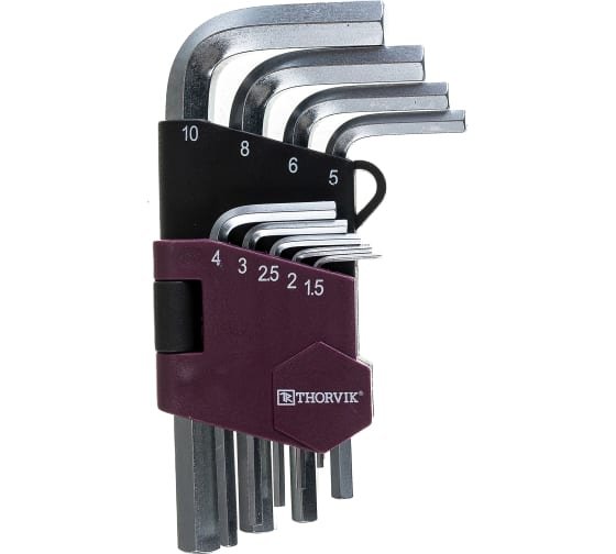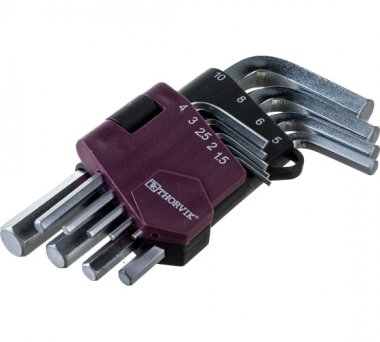 Набор торцевых шестигранных коротких ключей Thorvik HKS9S H1.5-H10, 9 предметов 53021 выполнен из высокопрочной стали, которая выдерживает усиленное вращение инструмента.