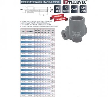 Технические характеристики ударной глубокой торцевой головки THORVIK 53462