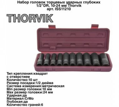 Набор головок торцевых ударных глубоких 10 шт, 10-24 мм, 1/2"DR THORVIK ISS11210 53463 используется для монтажа/демонтажа резьбовых соединений. Предназначен для ударных гайковертов.