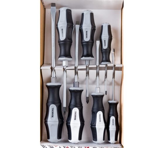 Набор стержневых ударных отверток Thorvik SDGS7CP 7 предметов 52288 включает в себя инструмент наиболее распространенных размеров. Хромванадиевые стержни обеспечивают максимальный срок службы инструмента в сложных условиях. Двухкомпонентные рукоятки устойчивы к агрессивным средам. Все отвертки выполнены согласно международным стандартам DIN.
