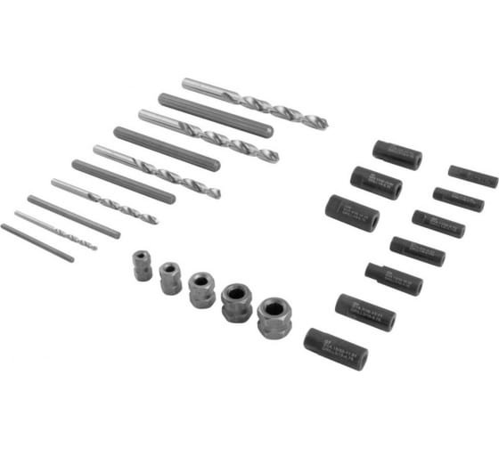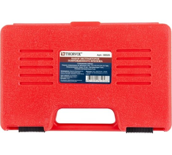 Набор экстракторов поврежденного крепежа Thorvik SES25 25 предметов 53202 предназначен для демонтажа резьбовых шпилек и болтов диаметрами от 5 до 16 мм. Изделия, входящие в комплект, позволят без повреждения резьбы удалить утопленную или выступающую часть сломанного резьбового соединения.