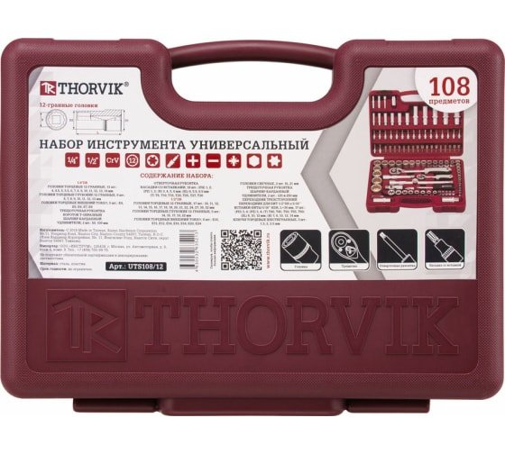 Универсальный набор инструмента THORVIK 1/4, 1/2 UTS0108/12 включает в себя большое количество инструмента для работы с разнообразными типоразмерами крепежа. Комплект поставляется в прочном пластиковом кейсе. Удобное расположение элементов набора обеспечивает быстрый подбор нужного снаряжения.