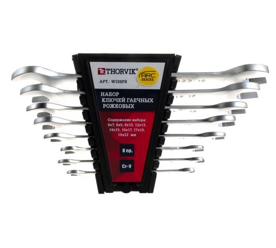 Набор рожковых гаечных ключей Thorvik W1S8PR серии ARC, 6-22 мм, 8 предметов 52618 подходит для работ с резьбовыми соединениями. Имеет распространенные размеры головок.